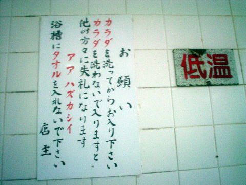 まずは右端の「低温」の湯舟から入湯するが、 これが結構熱い。 実測48.3度あって決して「低温」ではない。 先客の方に話を伺ったが 今日はちょっと熱いめだと言いながら 水の蛇口を開けて温度を下げていた。 ![]() 湯に浸かるときの「お願い」 「アア ハズカシイ」 よく注意書きを読んでお入り下さい。 ![]() 湯舟壁際には飲泉できるように 1合升が置かれていたので飲泉すると、 日の出湯のものとは塩の加減がちょっと違うようです。 永寿湯の方が塩分控えめといった感じで飲みやすい。 ゆっくり味わうまもなく湯の熱さで外に飛び出した。 中央の[中温]湯舟に挑戦です。 入湯する前に温度を測ると実測なんと50.5度! 熱い湯に慣れてきたとはいえ50度オーバーの湯はさすがに熱い。 ゆっくりと湯に首まで浸かるが10秒が限界だ。
